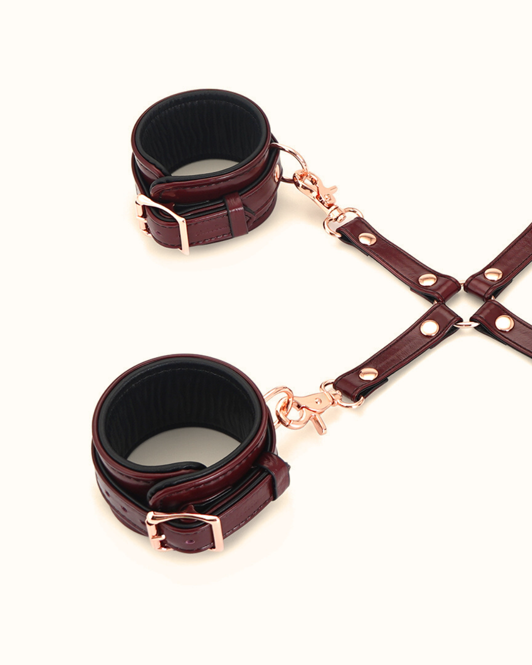 Arnés con collar y esposas que conecta cuello y muñecas. Ideal para explorar la rendición total y esa linea deliciosa entre la vulnerabilidad y la seguridad.