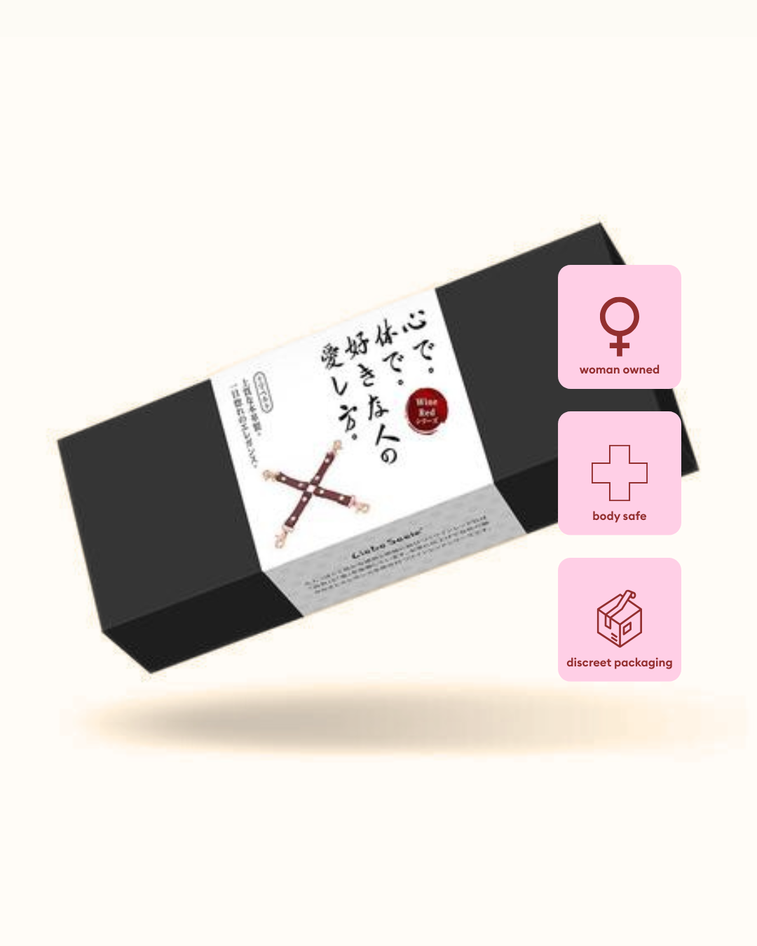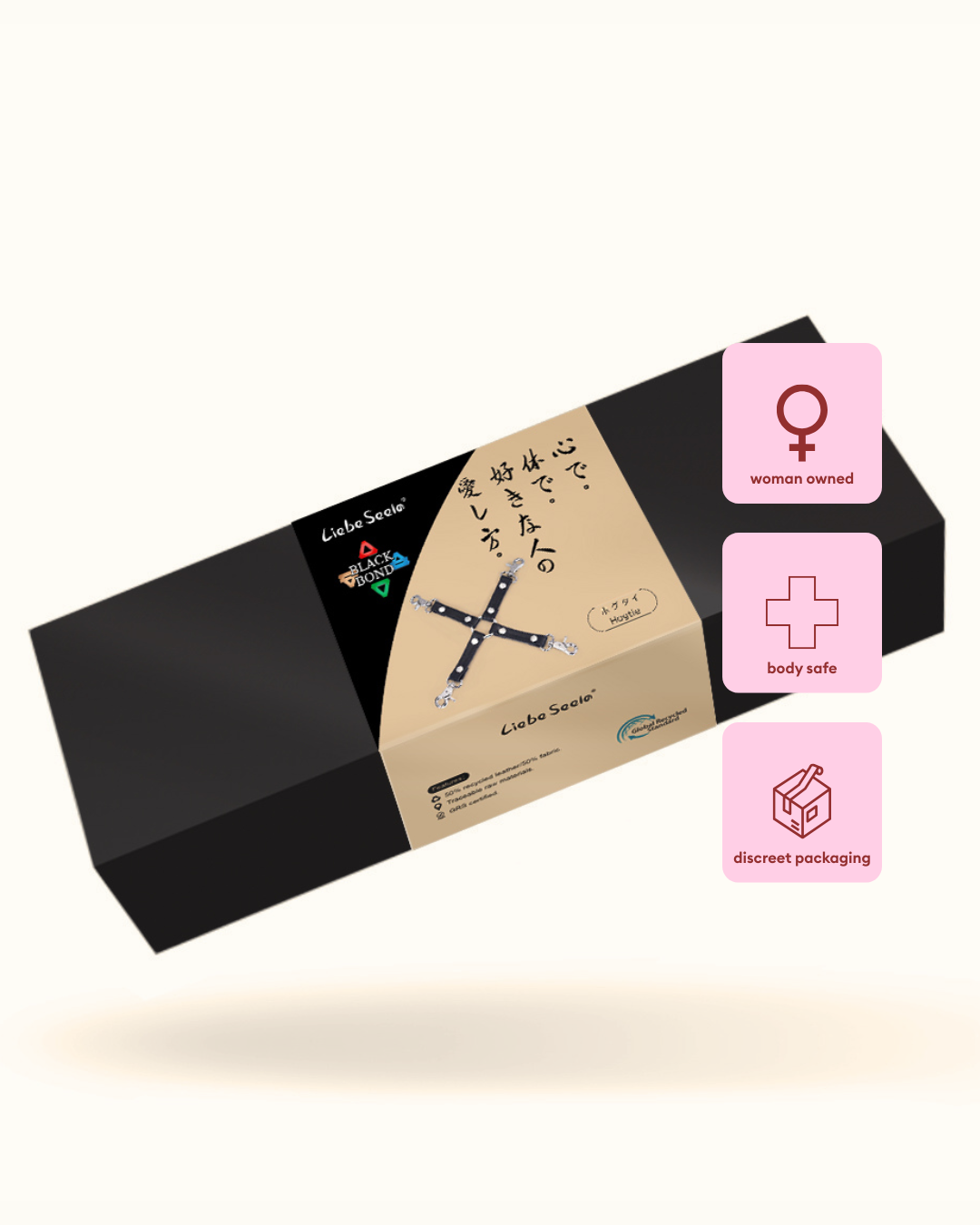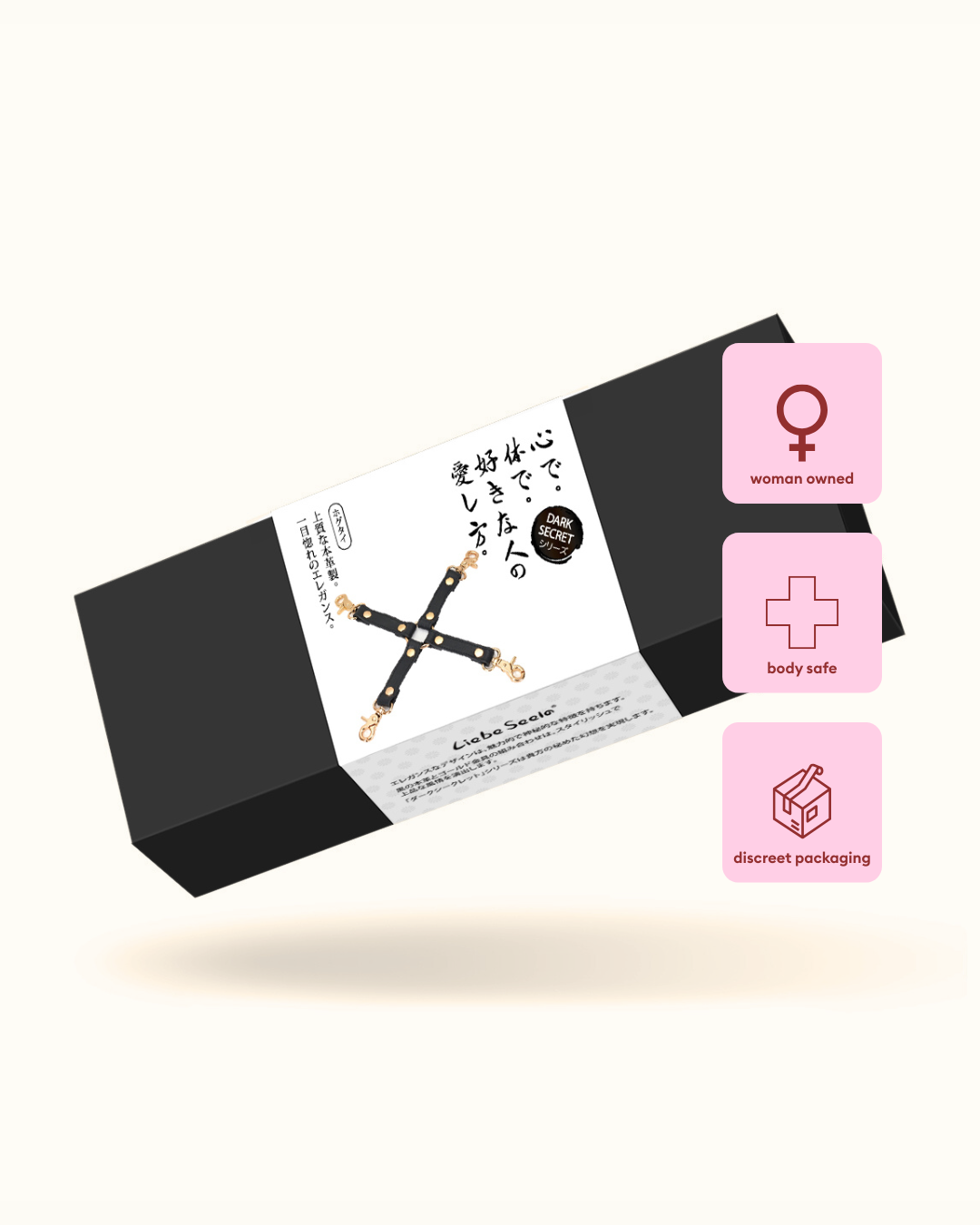 Amarre en X que inmoviliza manos y pies. Ideal para explorar la rendición total y esa linea deliciosa entre la vulnerabilidad y la seguridad. Hecho de cuero reciclado y resistente, con clips rápidos.