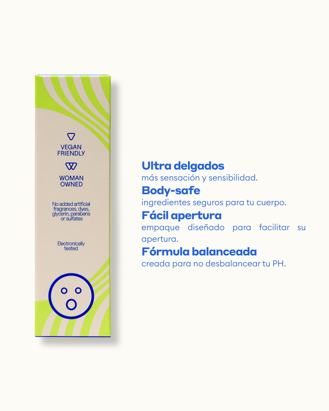 100% látex natural · Ultrafinos · Veganos · Lubricados a base de silicona · Empaque fácil de abrir
