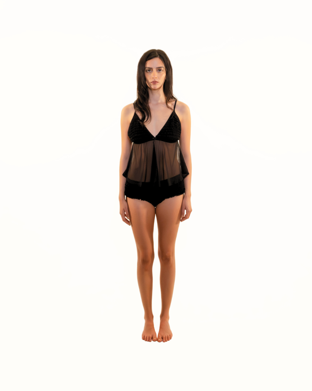 Ni tan inocente, ni tan spicy: puro mood coqueto, para ponerte bien cachocha. Set de 2 piezas con holanes de mesh: un top con copas suaves con holanes, banda elástica bajo el busto para soporte, ligero y tirantes ajustables. Coqueto, cómodo y con corte cheeky.