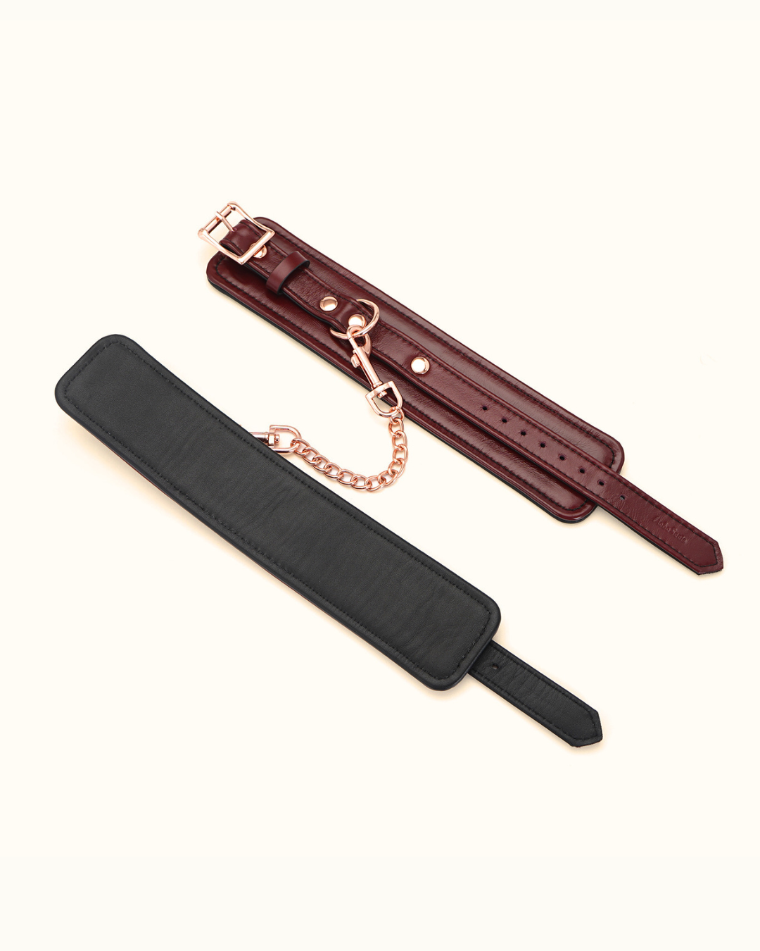 Esposas para tobillos de cuero rojo vino con herrajes rose gold, cómodas pero intensas, para rendirte un poquito más.