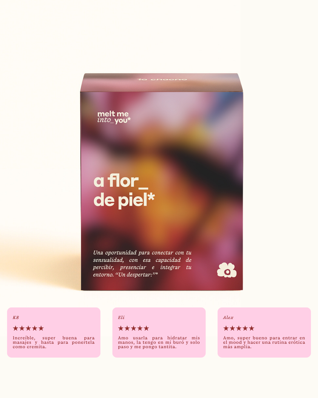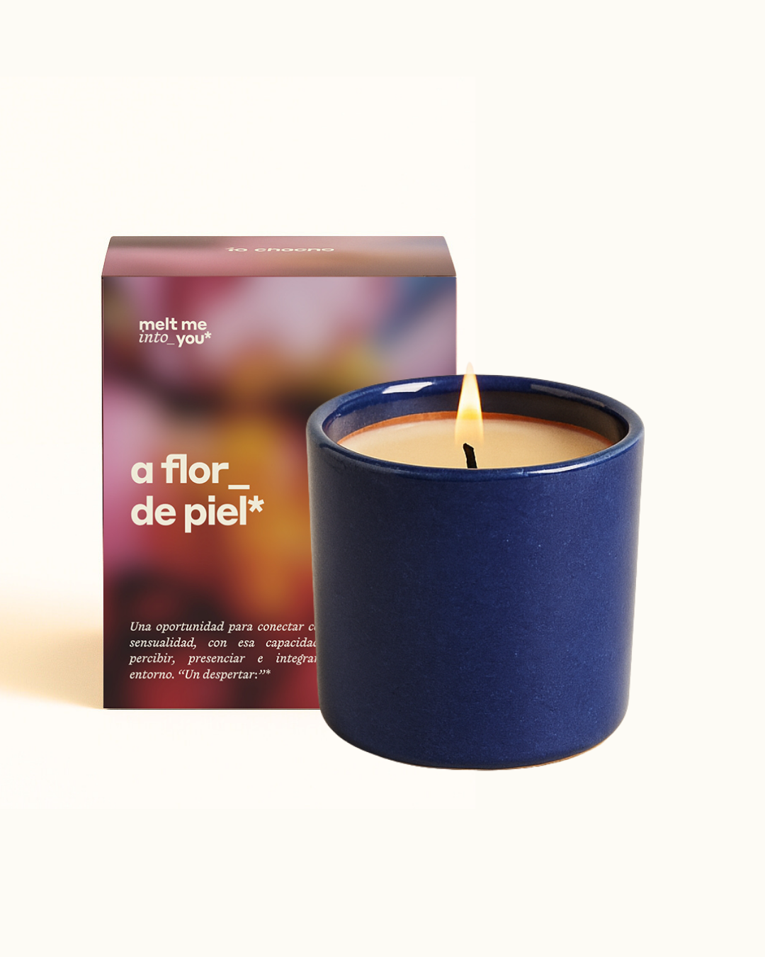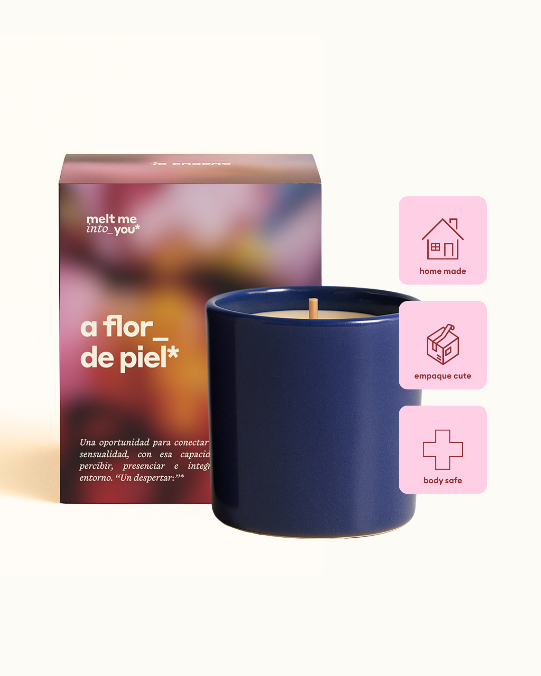 Una vela para derretirse en caracias, jugar con fuego y dar o recibir un masaje que podría terminar en algo más. A flor de piel: una vela natural que al encenderse despierta la sensualidad, perfuma el espacio y se transforma en un aceite tibio para masajes eróticos. Una herramienta para habitar tus encuentros con presencia, confianza y todos los sentidos despiertos.